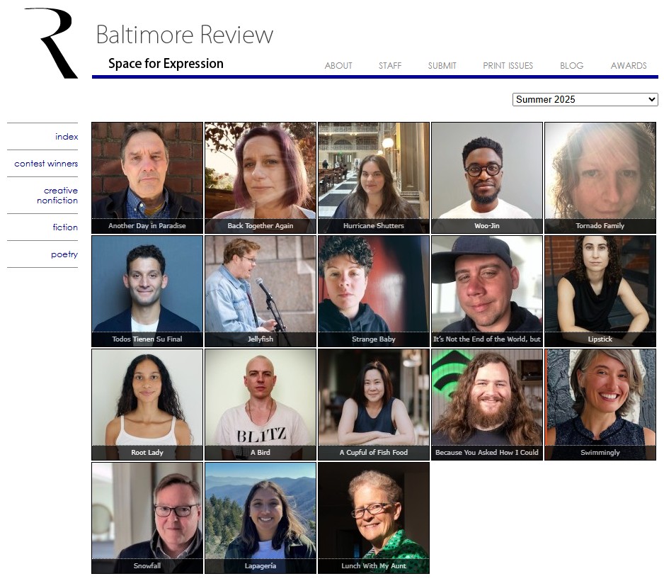 We hope that you enjoy the poems, short stories, and creative nonfiction by the following writers in our summer 2025 issue, published today, July 15!