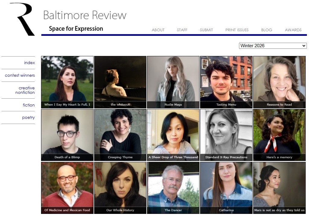 We hope that you enjoy the poems, short stories, and creative nonfiction by the following writers in our winter 2026 issue, published on January 20, 2026.
